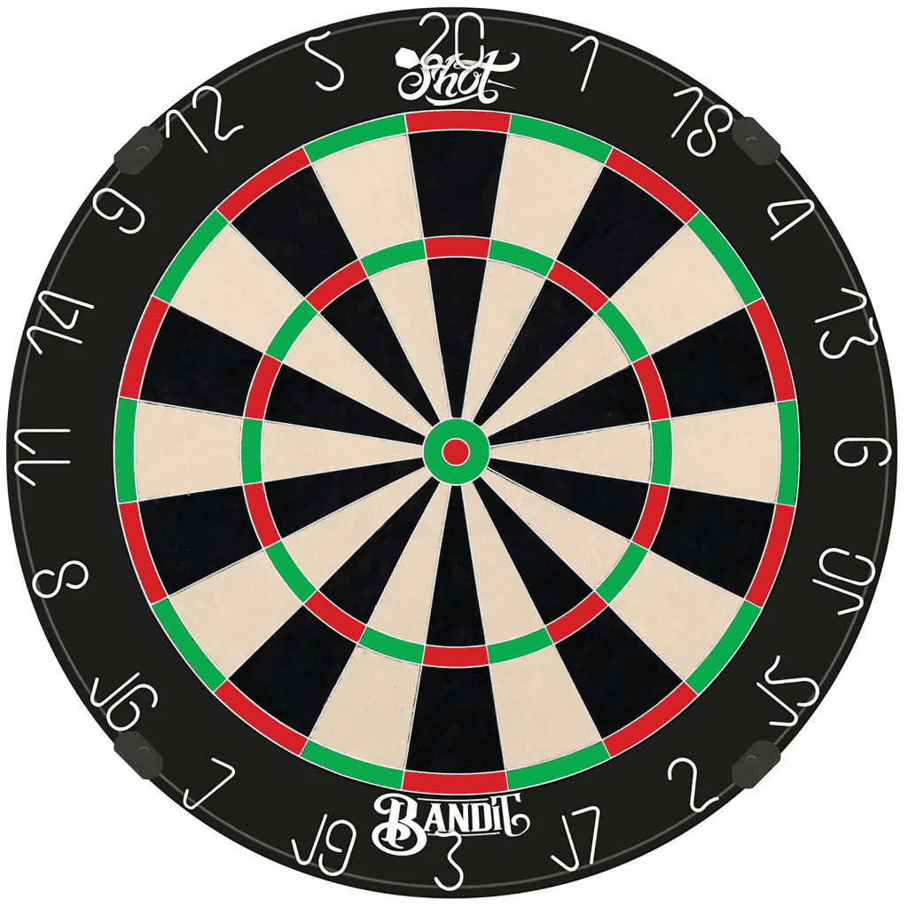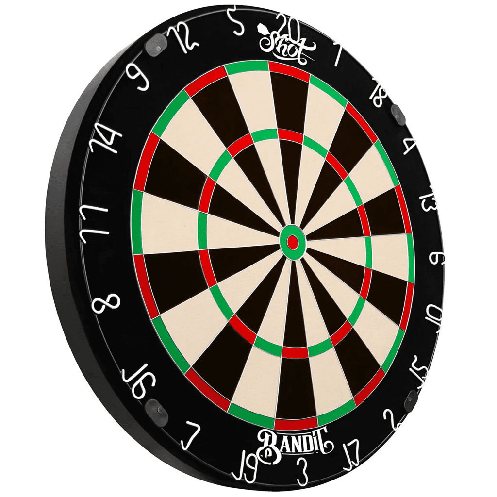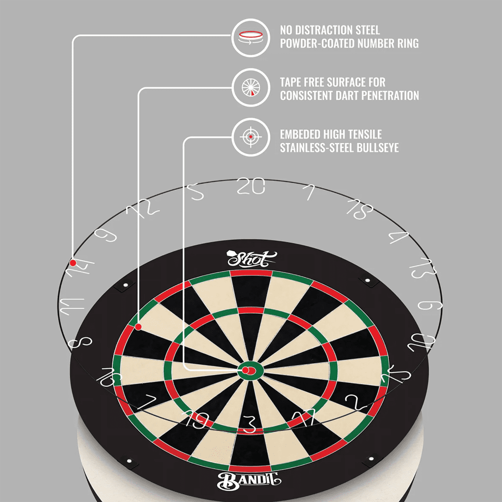 The Shot Darts Bandit Generation 4 bristle dartboard is a game-changer. Its embedded one-piece stainless steel bullseye combines precision machining with high tensile strength to resist bending and ensure long-lasting durability. The inner bullseye chamfer design directs darts into the bull area, enhancing scoring accuracy. With its premium African sisal fibers, advanced wiring system, and unique bracket system, the Bandit dartboard stands out as an exceptional choice.
