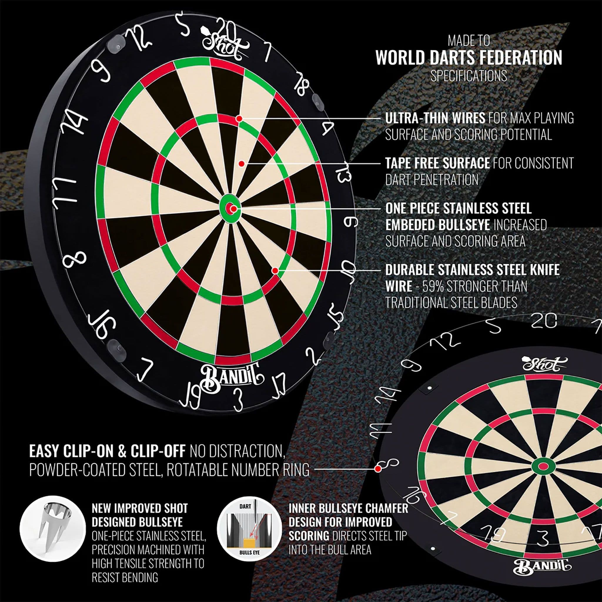 •0.8mm Wires: At 0.8mm thick, the Bandit’s wires are 50% thinner than those on traditional dartboards. Less metal surface area means fewer bounce outs and deflections.