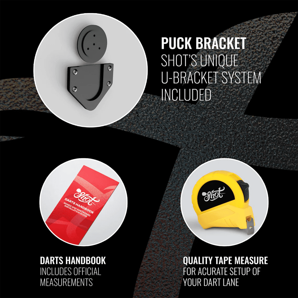 Measuring tape included to mark out dartboard mounting height and throwline. Also included is an instructional handbook with a checkout chart and popular dart games.